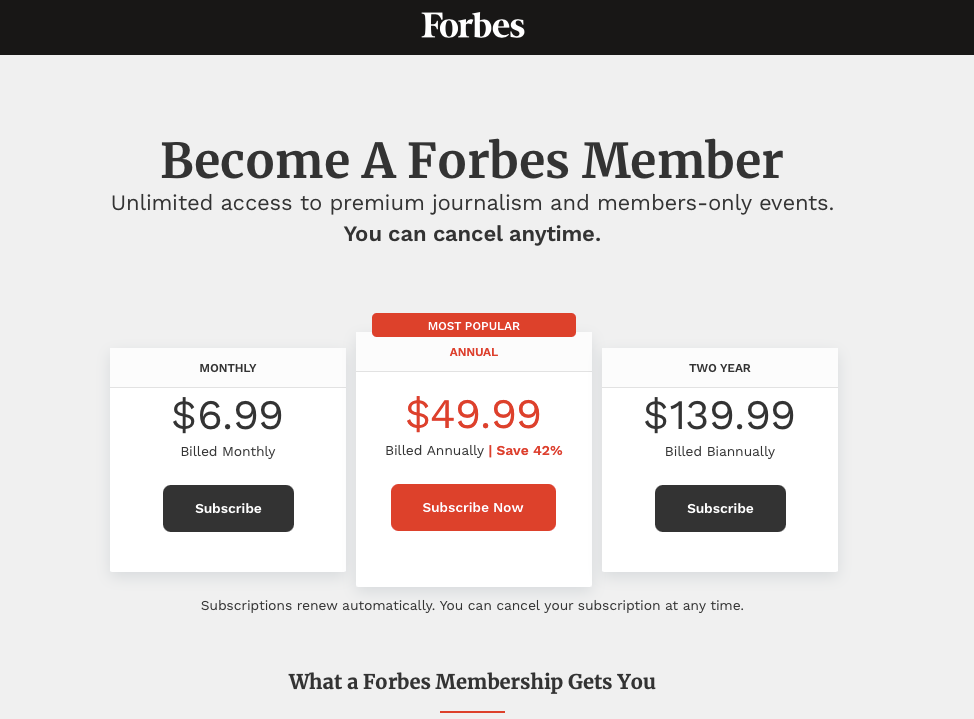 Forbes is trying out an intriguing pricing strategy: How many people do you think will opt for the two-year plan? And what might Forbes charge for a three-year subscription? SEE THE FORBES AD