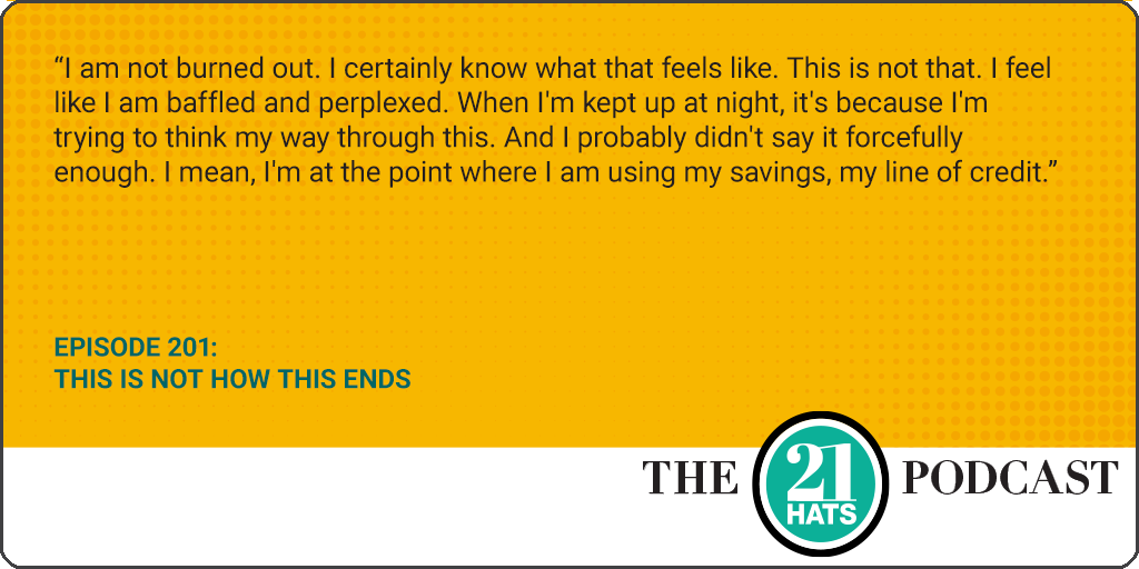 This Is Not How This Ends: This week, we bring you what we’re calling an Entrepreneurial Fish Bowl with Chris Hutchinson. As you may remember, we recorded one of these at our 21 Hats Live event in Fort Worth, where I shared some of my challenges trying to build 21 Hats and got feedback from the group. We recorded that conversation and turned it into a podcast episode. This time, we’re doing the same thing except it is Jaime Echt, founder and CEO of The Crafters Workshop, who explains her challenges to a virtual group of 21 Hats entrepreneurs. As you’ll hear, Jaime’s challenges are real: Her sales are down. Her customers are aging. Her lease is up. And she’s not sure what she should do next. We’re going to see if a group of 21 Hats Founding Members can offer some support and advice.