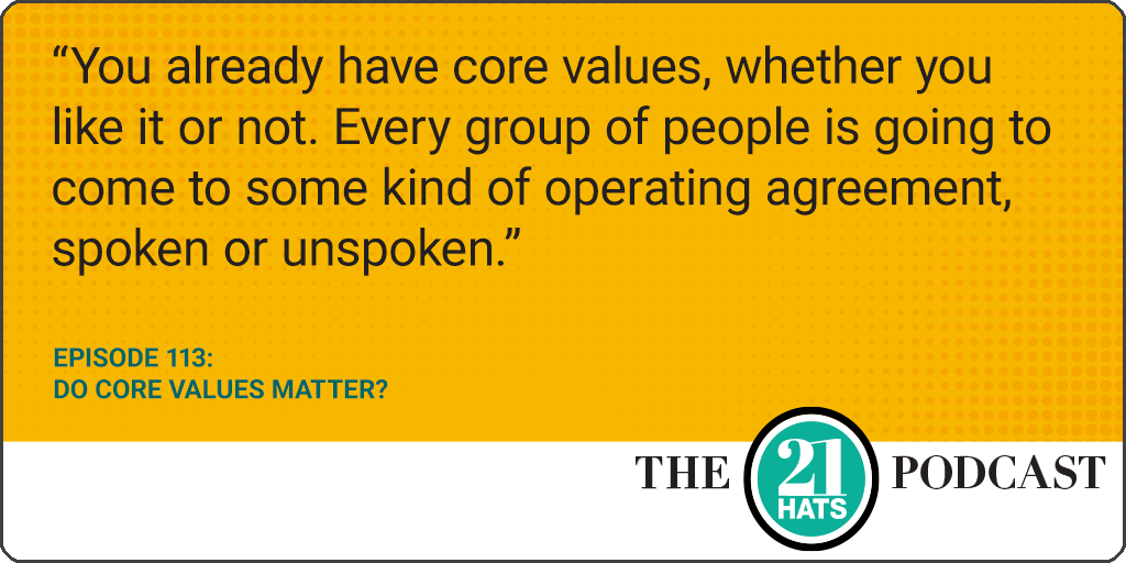 Do Core Values Matter? This week, Sarah Segal tells Shawn Busse and Paul Downs why she’s never articulated a set of core values for her business and why she’s thinking about doing it now. But she’s wondering whether establishing her values will really make a difference. Do employees care? Do clients care? Both Shawn and Paul say they do. In fact, Paul says his core values have been extremely helpful when it comes to recruiting. And Shawn says he thinks sharing values can be the best competitive advantage smaller businesses have. Plus: We get an update on how Paul’s big marketing initiative is going, and we follow up on why Sarah feels compelled to participate in almost all of her firm’s client calls.