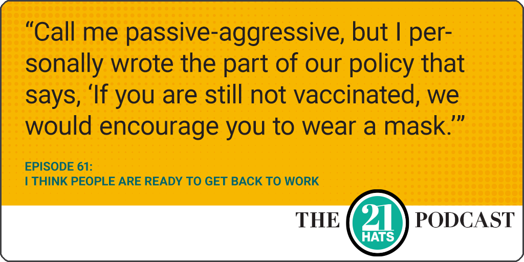 Episode 61: I Think People Are Ready to Get Back to Work: Is your office open? Is everyone coming back? Or are you going hybrid? Is everyone getting vaccinated? Are you offering them incentives to get vaccinated? Are you having a problem filling jobs? Have you had to increase what you pay? Paul Downs tells us, “The people who really seem to want the job and are enthusiastic about it don't have the skill-set. And the people with the skill-set don't seem to actually care about completing the process. So we did hire one guy who started a week ago Monday, and he quit three hours later.”