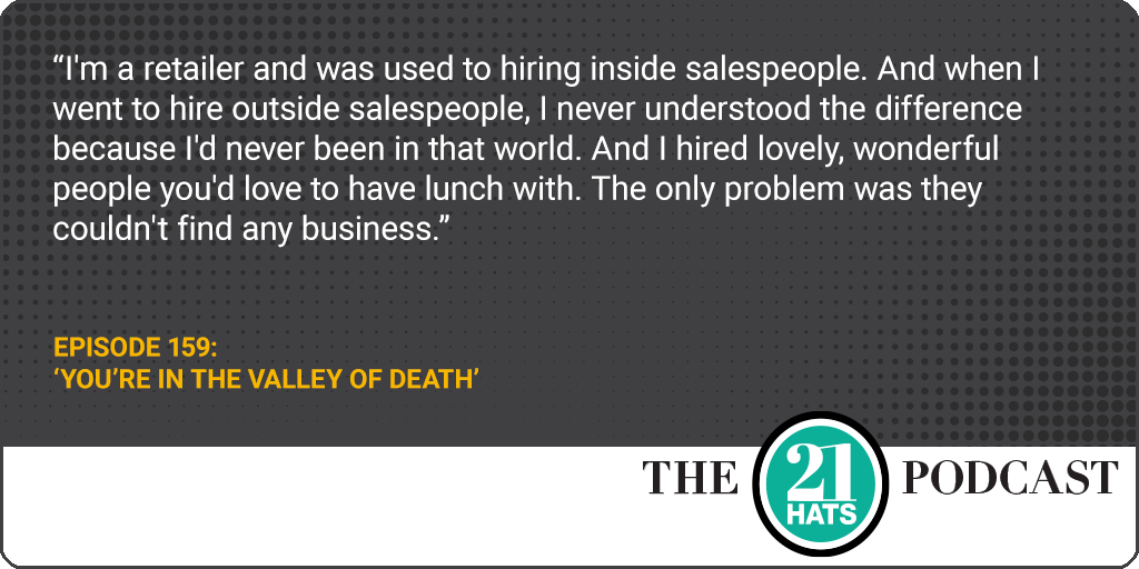 ‘You’re in the Valley of Death’ This week, Shawn Busse, Jay Goltz, and Jennifer Kerhin talk about that difficult transition when the owner of a growing business can no longer handle all of the most important tasks herself but also can’t quite afford to hire the people she needs to lighten her load. It’s part of the reason Jennifer, as she’s told us in previous episodes, has been working 12-hour days, six days a week. It’s a challenging transition, and it has a name: It’s the “valley of death,” says Shawn, who compares it to crossing a desert. We also discuss how big the owners want their businesses to get, why important tools and processes seem to break with every $500,000 of revenue growth, and what constitutes the proper care and feeding of salespeople.