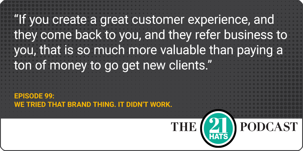 We Tried That Brand Thing. It Didn't Work: This week, Shawn Busse, Paul Downs, and Jay Goltz talk about the tendency of many businesses to obsess about their logo, their website, and the need to drive more leads. To which Shawn suggests concentrating first on customer experience. And Jay agrees: “It's better business,” he says, “to make your customers happier than to keep trying to find new customers.” But Paul has his doubts: “You can have your internal house in order, as I do,” he says. “And you can have a great website, as I do. But it's not driving new business to us at the moment.” Plus: Shawn, Paul, and Jay react to recently publicized strategies to address the labor shortage, such as giving out raises more than once a year and encouraging new employees to take a vacation before they start work.