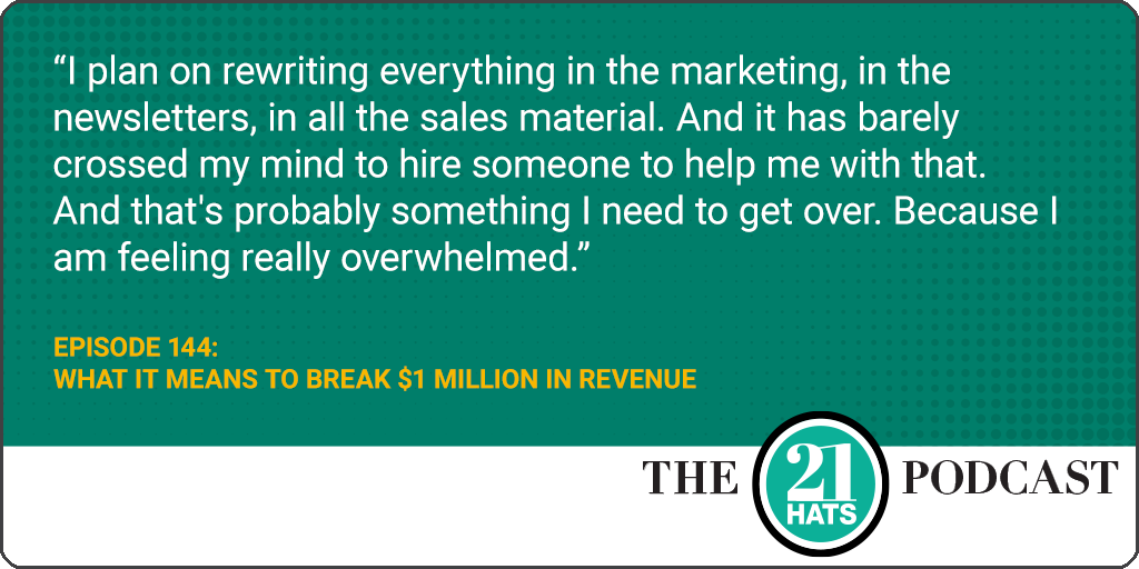 What It Means to Break $1 Million in Revenue: This week, in episode 144, Liz Picarazzi and Sarah Segal talk about their attitudes toward growth, including how they set goals, the tension between revenue and profit, deciding when growth requires additional bodies, choosing between contractors and employees, and how they would use the money if someone were to give them a million dollars to invest in their business. Plus: What will it take for them to consider themselves successful?