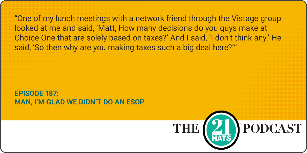 Man, I’m Glad We Didn’t Do an ESOP: This week, Matt Hoying, president of Choice One Engineering, explains to Shawn Busse and Jay Goltz how he created a DIY employee-ownership plan for his firm. Some 10 years ago, Matt’s predecessor as president tasked him with selecting an ownership structure that would engage employees and help Choice One be as successful as possible. That sent Matt on a mission in which he researched the pluses and minuses of every structure he could find—including employee stock ownership plans—before ultimately creating his own structure.