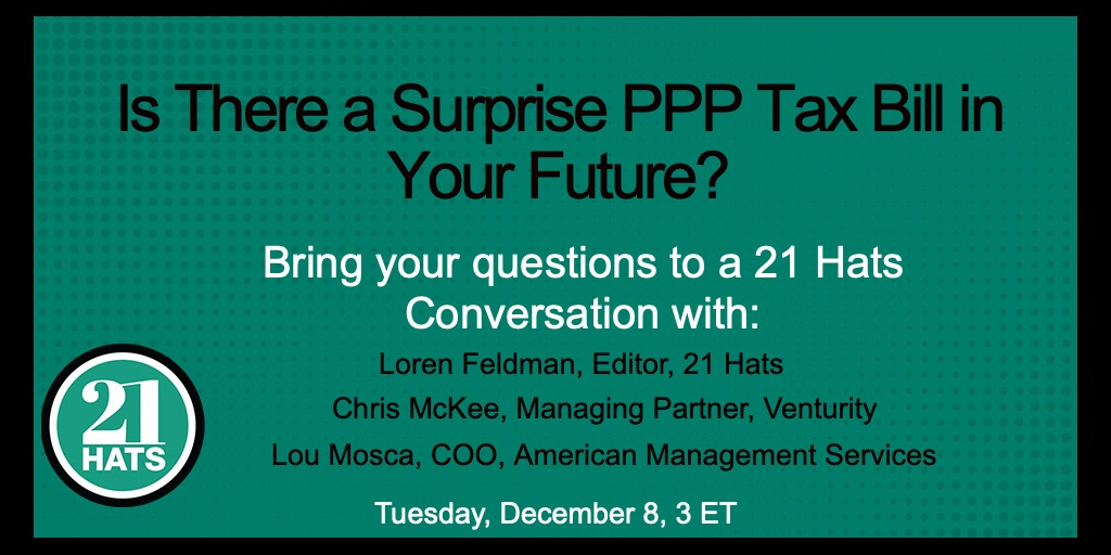 Is there a surprise PPP tax bill in your future? Here’s the gist: If you get your PPP loan forgiven, it essentially becomes taxable income. For many, that’s surprise No. 1. But it gets worse: You may not be able to deduct the expenses you paid with your loan. That’s surprise No. 2 -- and potentially a significant tax liability. Concerned? Join us Tuesday at 3 ET when we’ll try to sort out this and a few related issues with a couple of experts: Chris McKee, managing partner of accounting firm Venturity Financial Partners, and Lou Mosca, chief operating officer of management consulting firm American Management Services. Bring your own questions!