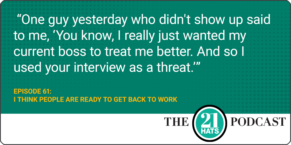 Episode 61: I Think People Are Ready to Get Back to Work: Is your office open? Is everyone coming back? Or are you going hybrid? Is everyone getting vaccinated? Are you offering them incentives to get vaccinated? When do the masks come off? Are you having a problem filling jobs? Have you had to increase what you pay? Paul Downs tells us, “The people who really seem to want the job and are enthusiastic about it don't have the skill-set. And the people with the skill-set don't seem to actually care about completing the process. So we did hire one guy who started a week ago Monday, and he quit three hours later.” This week, Paul, Stephanie Stuckey, and William Vanderbloemen compare notes on what they’re experiencing as we all search for that new normal.