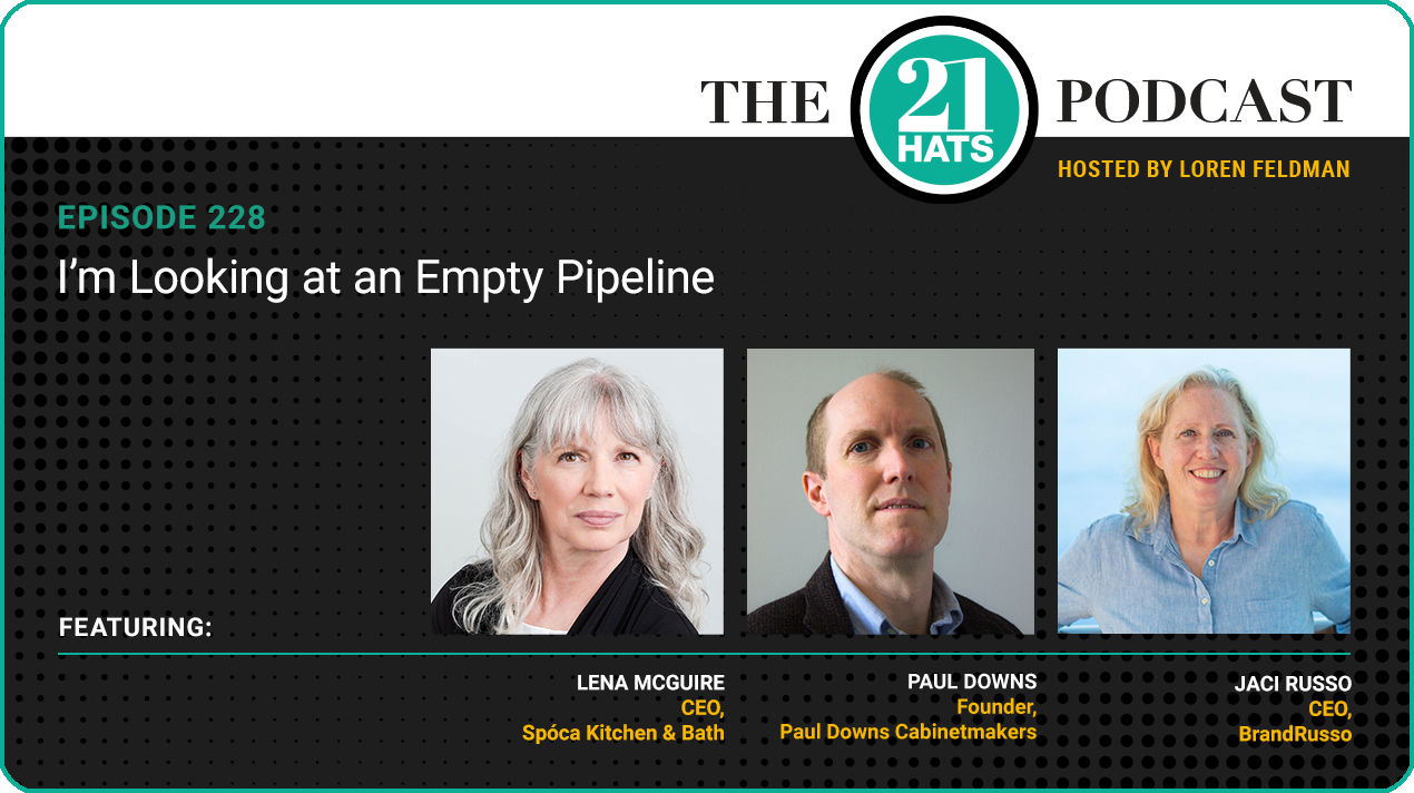 I’m Looking at an Empty Pipeline: This week, in episode 228, Lena McGuire—in her first appearance as a regular on this podcast—tells Paul Downs and Jaci Russo about her plans to turn her hobby, remodeling homes, into a real business. In just her third full-time year of building Spóca Kitchen & Bath, Lena says she has already experienced both a quick rise in revenue and then a surprising decline, a decline she attributes mostly to marketing issues. One of those issues, she says, is that she refreshed her website and it started producing more prospects—but fewer qualified prospects. That said, Lena is off to an impressive start, having targeted a well-defined niche, having created a clear process to connect homeowners and contractors, and having demonstrated both a real need for her services and an ability to learn from her mistakes. “I don’t look at failure as failing,” she says.