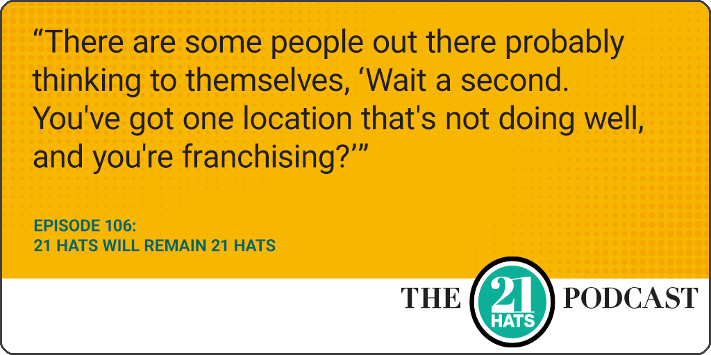 21 Hats Will Remain 21 Hats: This week, in episode 106, we start with an update of how 21 Hats has been doing since its sale brought new resources and new ambitions (Spoiler alert: The deal isn’t going great!). Then, Dana White tells Shawn Busse and Jay Goltz about the progress she’s made on multiple fronts: attempting to sell franchises to revive her struggling Midtown Detroit location, to open new salons at Fort Bragg and in Dallas, and to secure financing. The owners discuss Dana’s financing options—venture capital, private equity, bank loan—assessing, in Shawn’s words, their “degrees of evil.” Plus: Shawn explains how his views on remote work have been evolving, and Jay explains why he’s tired of being called a tyrant (even though no one’s actually called him that).