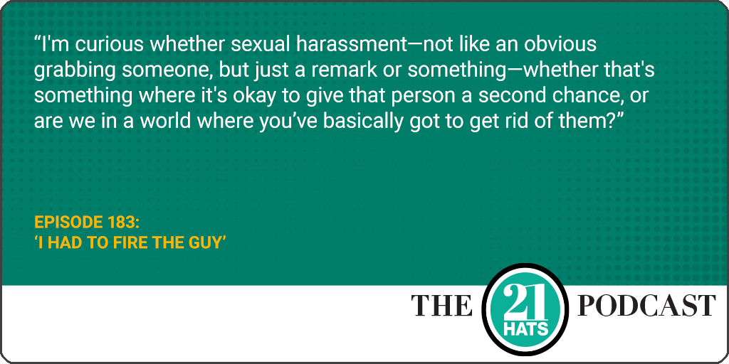 ‘I Had to Fire the Guy:’ This week, Paul Downs, Jay Goltz, and Sarah Segal talk about sexual harassment and where you draw the line with employees. Is it sexual harassment for one employee to ask another for a date? Is it sexual harassment to ask twice? Does it make sense to have a policy of zero tolerance? Or is it better to leave room for discretion and judgment? The conversation was sparked by a recent situation Jay experienced with an employee who had been with the company for almost three decades, having started at the age of 17. “It was a very sad thing,” Jay tells us.