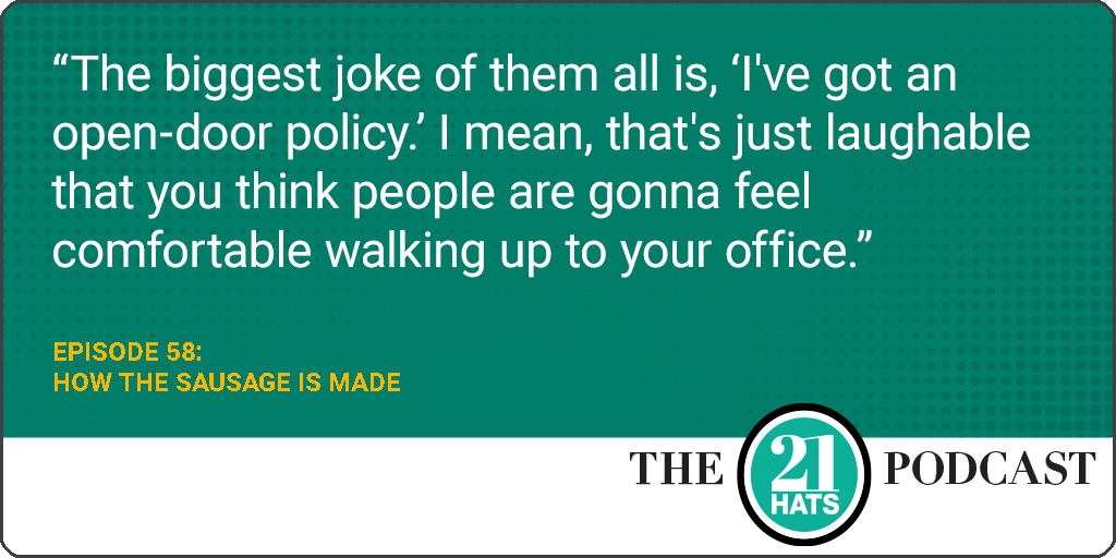 Episode 58: How the Sausage Is Made: In this week’s conversation with Karen Clark Cole, Jay Goltz, and Stephanie Stuckey, we once again unearth more questions than answers—mostly because there are rarely one-size-fits-all answers to the questions we discuss. This week, those questions include: Can you be friends with your employees? Can you work with your family? How are you coping with price increases in your supply chain? How do you handle shipping—especially given the example set by Amazon? Are refrigerated trucks really called “reefer” trucks? And what happens when employees question whether you should be doing business with a particular person or company? Plus: Jay turns 65 without a succession plan.