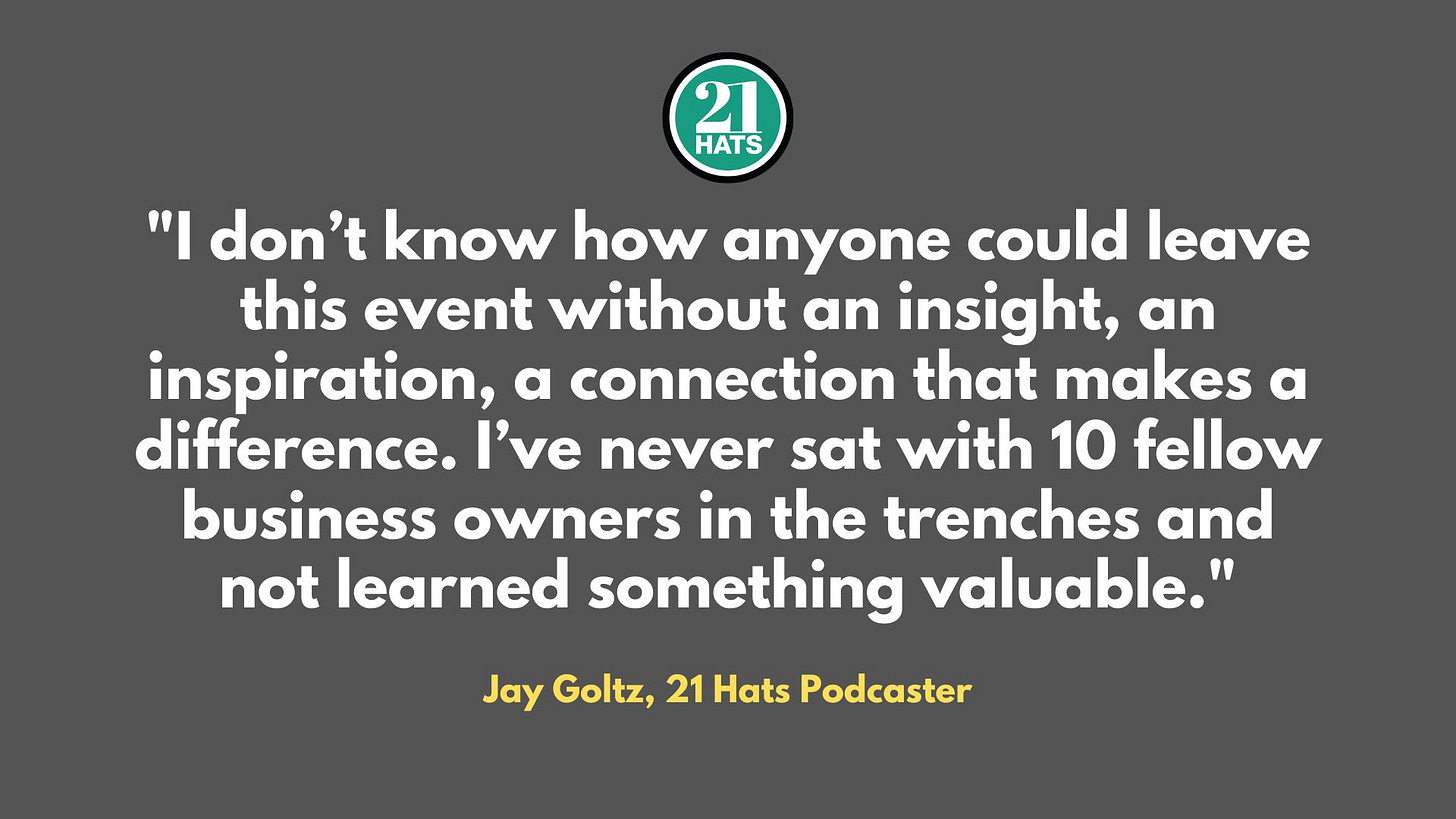Only four spots left: If you’ve been thinking about it, now’s the time to register for this intimate, three-day event that is limited to 20 business owners/CEOs, including podcast regulars Paul Downs, Jay Goltz, Liz Picarazzi, Sarah Segal, and Dana White. It starts with dinner on Wednesday, May 17, and runs through lunch on Friday, May 19. You’ll help choose the topics for two deep-dive peer group sessions. You’ll participate in the taping of a 21 Hats Podcast.