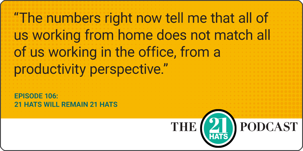 21 Hats Will Remain 21 Hats: This week, in episode 106, we start with an update of how 21 Hats has been doing since its sale brought new resources and new ambitions (Spoiler alert: The deal isn’t going great!). Then, Dana White tells Shawn Busse and Jay Goltz about the progress she’s made on multiple fronts: attempting to sell franchises to revive her struggling Midtown Detroit location, to open new salons at Fort Bragg and in Dallas, and to secure financing. The owners discuss Dana’s financing options—venture capital, private equity, bank loan—assessing, in Shawn’s words, their “degrees of evil.” Plus: Shawn explains how his views on remote work have been evolving, and Jay explains why he’s tired of being called a tyrant (even though no one’s actually called him that).