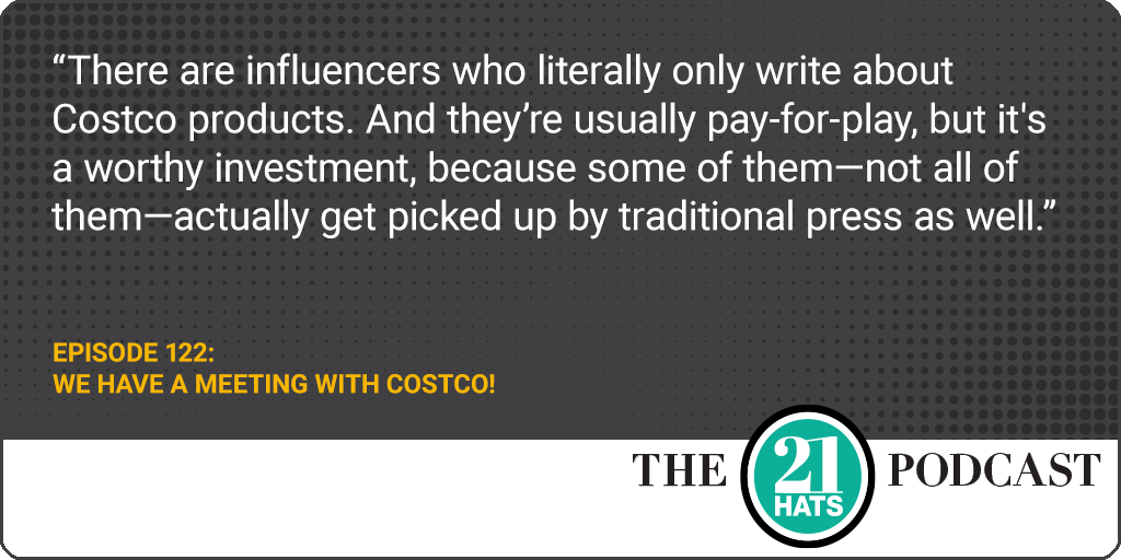RE: podcast Episode 122 "We have a meeting with Costco!" - 100 percent agree with Hans that Sarah's offering is way too customized and well-researched to be given for free lol. While it sounds like it's uncommon in the smaller boutique PR agency world, I submit that charging might make Segal Communications stand out in a good way. It's very possible that it will send the message to potential clients that your results are so effective that their investment will put them in an exclusive membership :-) It's a risk, but it sounds like your sales funnel is robust enough to try?