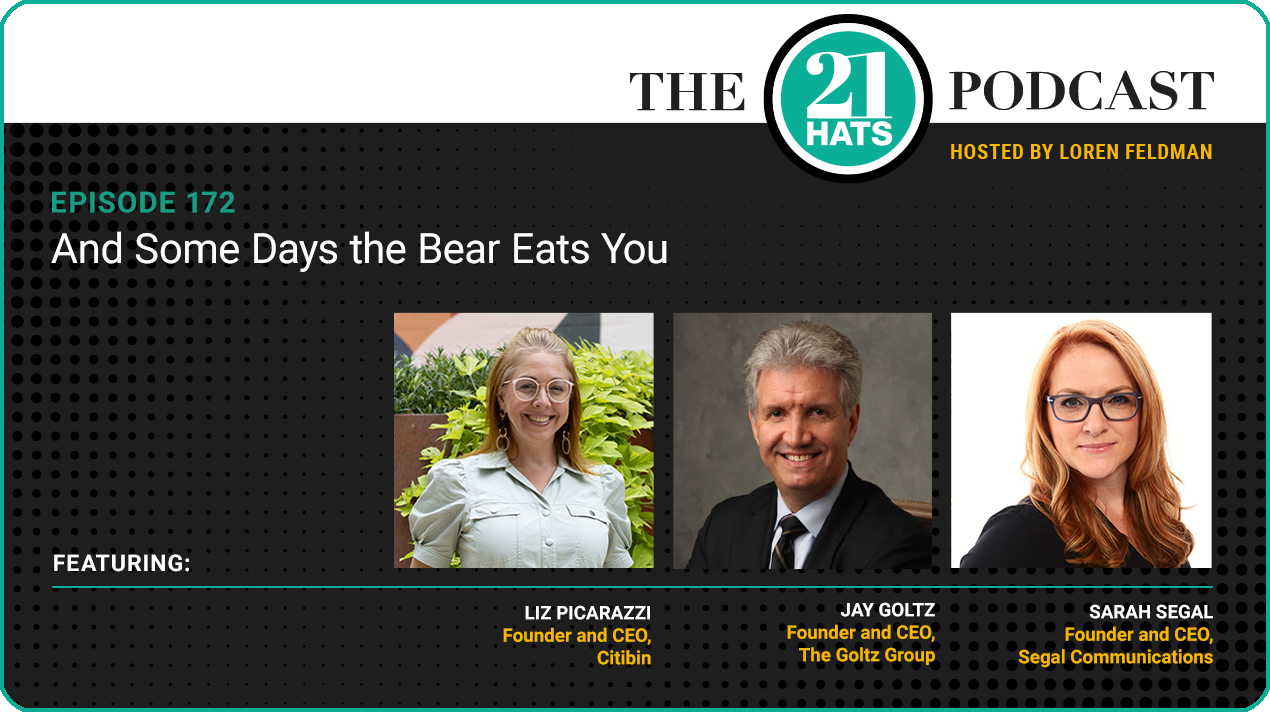 And Some Days the Bear Eats You: This week, Liz Picarazzi tells Jay Goltz and Sarah Segal that her trip to a bear sanctuary in Montana to get her trash enclosures certified as bear-resistant did not go precisely as planned. Because of a logistical snafu, she has not yet obtained either the certification or her real goal: a marketing video of the grizzlies attempting to crack open her baited enclosure. Fortunately, things went better for Liz in a more traditional marketing venue, a trade show in Chicago where she promoted her rat-resistant enclosures. Meanwhile, Sarah follows up on how things are going since losing two big clients and having to lay off three employees, and Jay explains his new catch phrase, “Let me not sleep on it.”