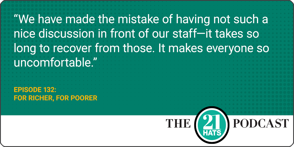 For Richer, For Poorer: This week, Liz Picarazzi, Hans Schrei, and Laura Zander talk about something they have in common: They all own and run their business with a partner who also happens to be a spouse. Which suggests some interesting questions: Is someone in charge? How do they divvy up responsibilities? What do they talk about? What do they fight about? Do they fight in front of the employees? How do they make decisions? Who does the dishes? Do they ever wish they were not in business with their spouse? Do they know what would happen to the business if they were to divorce?