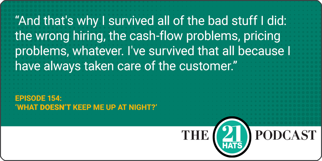 “What Doesn’t Keep Me Up at Night?” This week, we did something different. We recorded this session in Chicago at our very first 21 Hats in-person event. In May, some 20 impressive entrepreneurs from around the country, from different industries, with businesses of different sizes and stages, gathered to talk shop for three days. The last thing we did was to record this episode in which we gave the participants the opportunity to ask the podcast regulars anything they wanted. Those regulars included Jay Goltz, Sarah Segal, and Dana White, and the questions addressed everything from hiring to motivating to delegating to pricing to coping with stress to what they wished they’d figured out sooner and to what still keeps them up at night. And when there were no more questions, I asked those who attended the Chicago event what I could have done to make it better. That I would invite criticism in a conversation being recorded for a podcast audience, took some of the participants by surprise. But, as you’ll hear, it worked out pretty much the way I hoped.