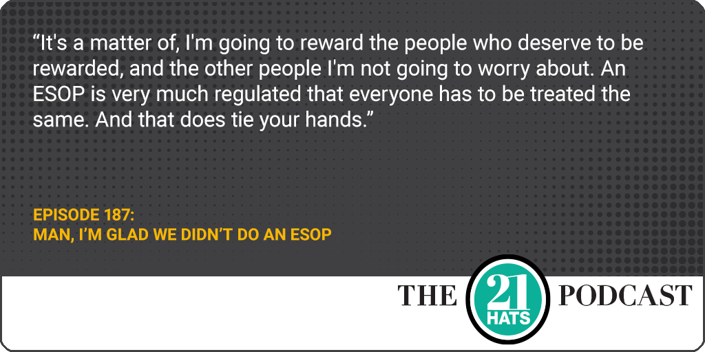 Matt’s plan doesn’t enjoy the tax advantages of an ESOP, but it’s open even to part-timers, and it requires employees who want to be owners to make a financial investment in the business. In other words, they aren’t given ownership; they have to buy into it. Shawn and Jay quiz Matt on the choices he made and how the plan has worked out.