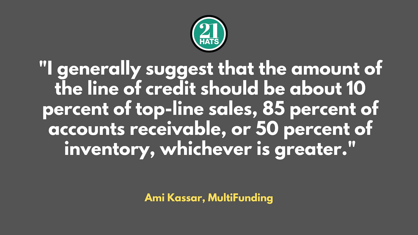 “When you obtain a line of credit, I generally suggest that the amount should be for about 10 percent of your top-line sales, 85 percent of accounts receivable, or 50 percent of inventory, whichever is greater.” READ MORE.