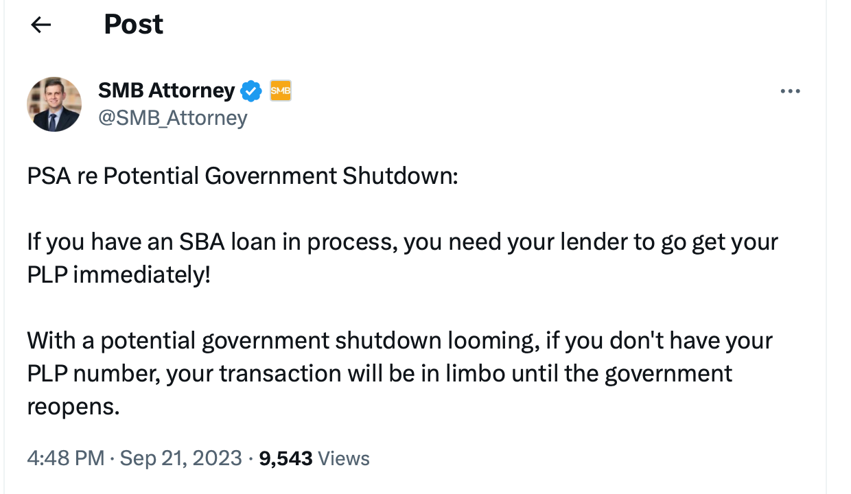If you’re trying to get an SBA loan, try to get it done before the government shuts down.