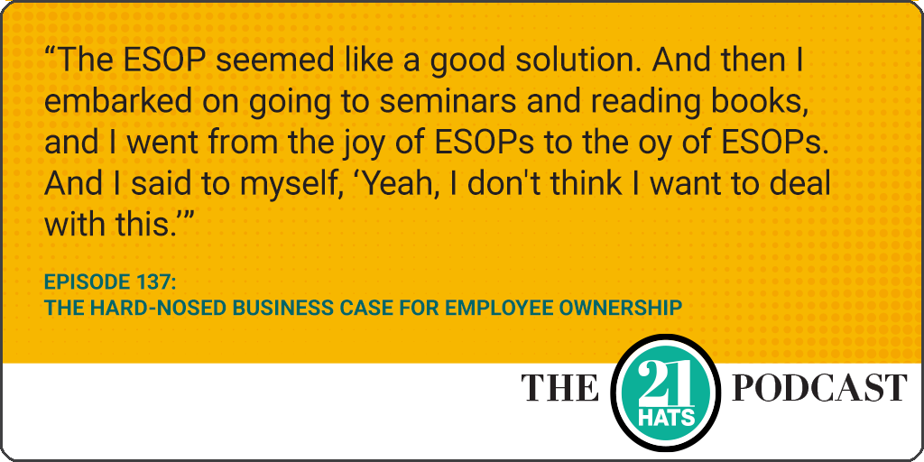 This week, Jay Goltz explains how he got interested in selling a percentage of his business to his employees and why he quickly lost interest once he started reading books, attending seminars, and talking to accountants and lawyers who specialize in employee stock ownership plans. To Jay’s ear, they all made ESOPs sound expensive, complicated, and risky. This was not something he needed to do. So why go to the trouble? Why take the risk? But he kept asking questions, and over time, he sensed that many of the problems he was being warned about didn’t have to be problems. As of now, he’s pretty much concluded that an ESOP could help him secure retirement for his employees while generating more profit for his business. In fact, he says, “I'm confident I can make more owning 70 percent of the company than I am now owning 100 percent.”