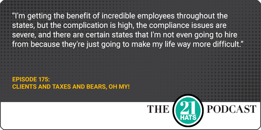 Clients and Taxes and Bears, Oh My! This week, Jaci Russo explains how she put an end to her eight-month drought of new clients. Jennifer Kerhin takes us through the bureaucratic nightmare of managing remote workers based out of state (“That is a headache that I don't wish on my worst enemy,” says Jaci, who has found a way to sidestep the problem). And Liz Picarazzi brings us up to date on her ongoing struggle to get her trash enclosures certified as bear-resistant. The common thread to these challenges may lie in these two questions: When is continuing to fight the good fight the definition of entrepreneurship?