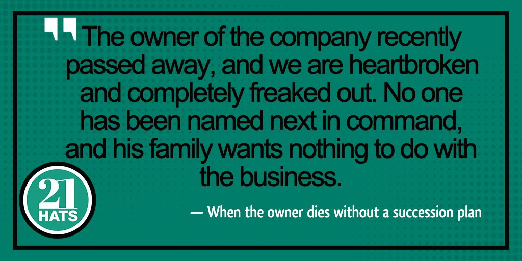 Here’s what it can look like when a business owner dies without a succession plan: “I work for a very small luxury travel agency that was already suffering due to the covid-19 pandemic. The owner of the company recently passed away, and we are heartbroken and completely freaked out. No one has been named next in command, and his family wants nothing to do with the business. We don’t even know if we’ll be paid out from the accounts. Also, quite a few trips are still booked in the coming months for clients who have zero idea what’s going on, and we don’t know what we’re allowed to tell them. We want to help ensure our travelers still get to go on their trips, but of course we can’t work for free and will eventually need to find other jobs to pay our bills.” READ MORE