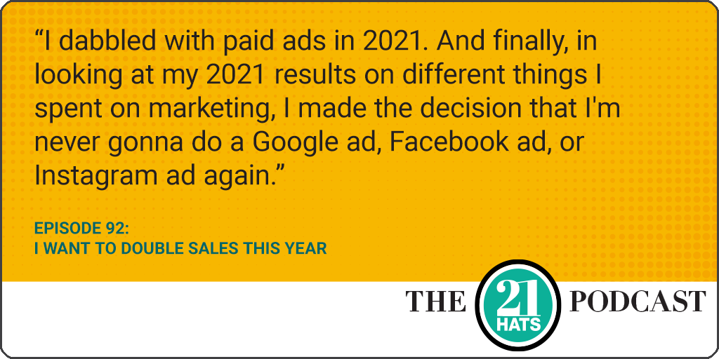 “This is a bad subject for me, but I have some resolution on it. I dabbled with paid ads in 2021, as I always have in previous years. And finally, in looking at my 2021 results on different things I spent on marketing, I made the decision that I’m never gonna do a Google ad, Facebook ad, or Instagram ad again. The only way I would do it—and I’m actually open to this, and maybe even some 21 Hats listeners can convince me of this—is that I would need someone to tell me, ‘How do you do this right?’ Because I’ve paid people to do it. I’ve tried to do it myself. There are definitely a lot of snake oil salesmen out there. So I made this decision, and I felt like it kind of took a lot of spending in order to come to that decision, which I don’t like. But it was a firm decision, and I declared it to the team last week.”