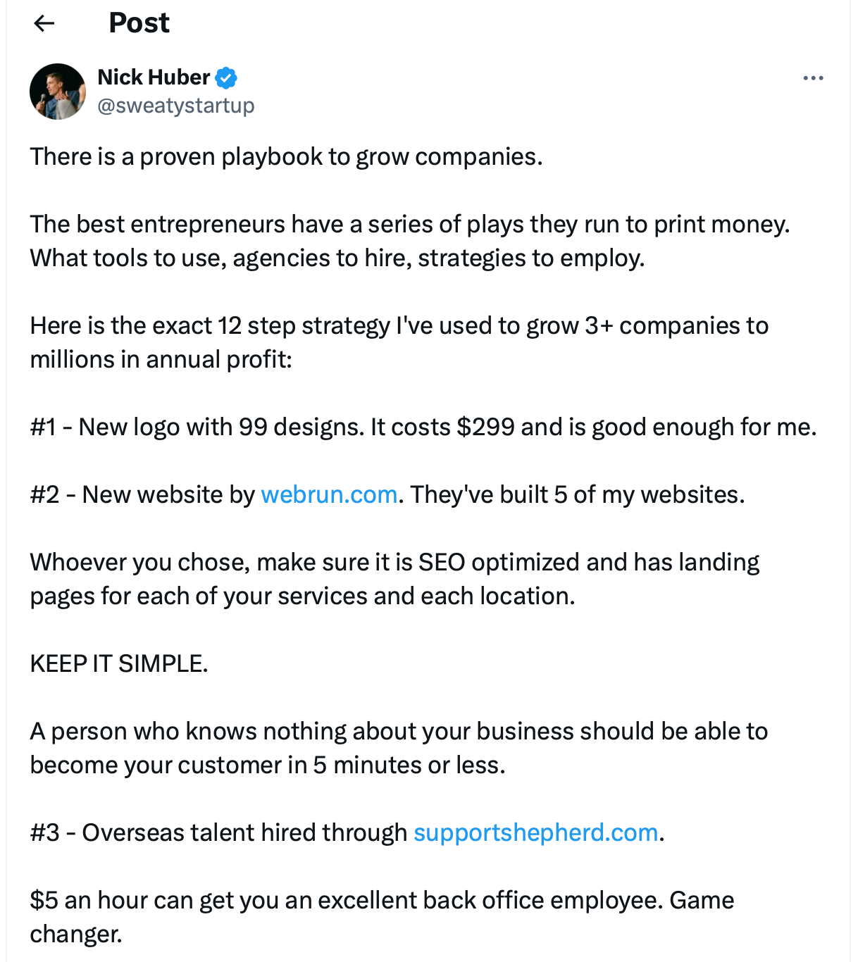 Nick Huber of The Sweaty Startup offers his playbook for building businesses: